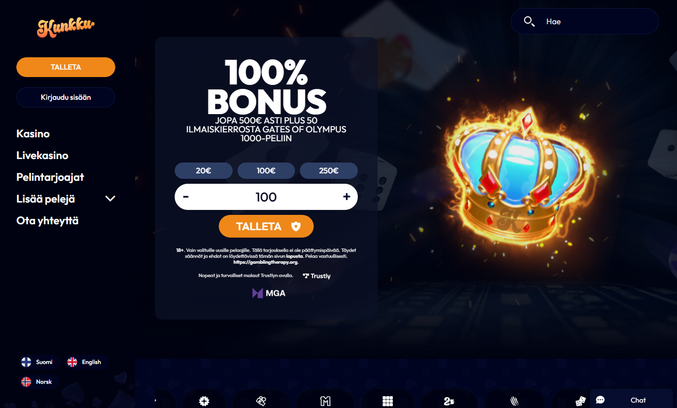 Kunkku Kasino is a newly launched Pay N Play online casino in 2025, created especially for Finnish players who appreciate speed, security, and effortless gameplay. Operated by a trusted gaming company and licensed by the Malta Gaming Authority (MGA), Kunkku Kasino guarantees full EU compliance, fair play, and tax-free winnings for Finnish players.