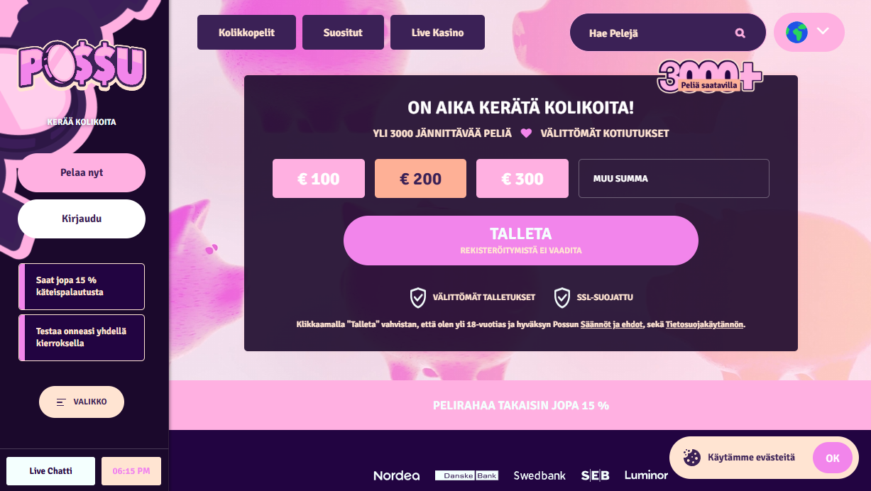 The casino features a wide selection of games, including new slots, classic table favorites, and a premium live casino section, all optimized for flawless mobile play. Strong SSL encryption protects every transaction, while bonuses and regular promotions add extra excitement. Focused on convenience, reliability, and high-quality entertainment, Possu Kasino stands out as one of the top Finnish Pay N Play casinos in 2025.