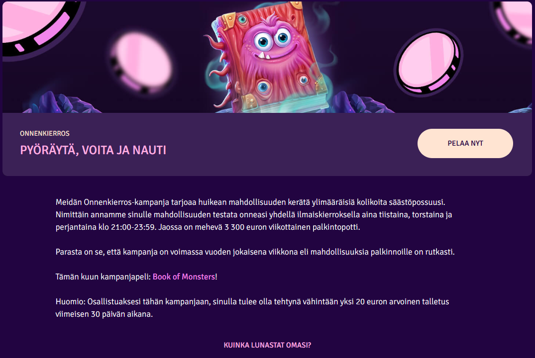 Thanks to bank-based authentication (Brite), players can make instant deposits and withdrawals directly from their Finnish bank — no lengthy registration or verification required. Possu Kasino’s clean, mobile-optimized platform makes it one of the most convenient Finnish online casinos in 2025.