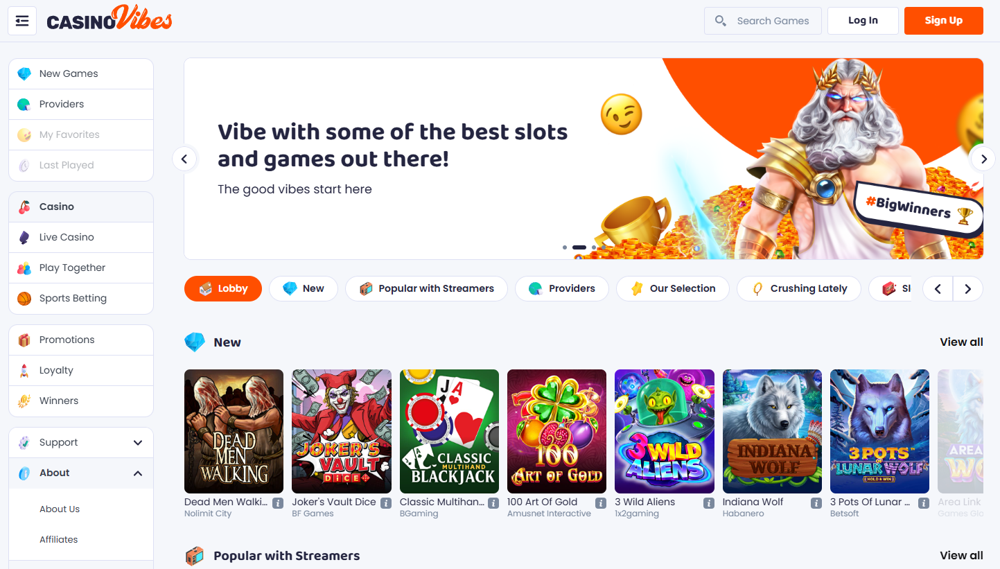 CasinoVibes is a modern online casino and sportsbook operating under a Curaçao license. It combines a wide range of casino games with sports betting on a single platform. With strong security, fast payment methods, and attractive bonuses, CasinoVibes is a reliable and entertaining choice for players.