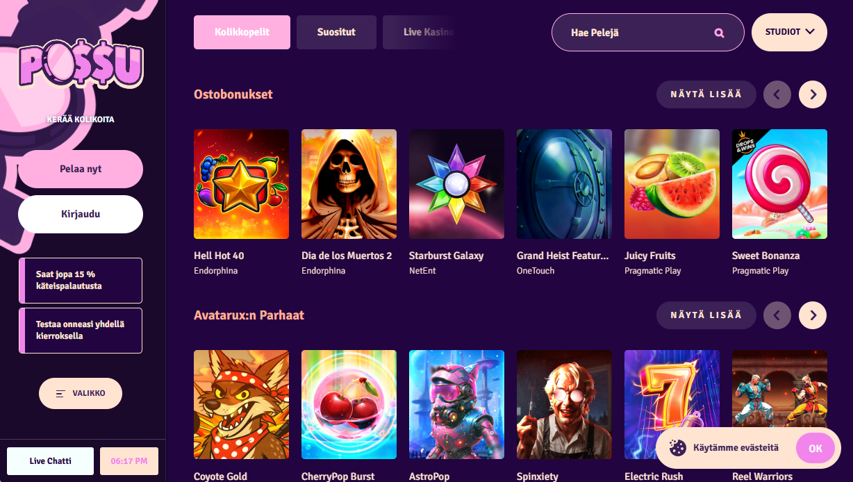 Possu Kasino offers a diverse game collection from leading software providers like Play’n GO, NetEnt, Pragmatic Play, and Evolution Gaming.